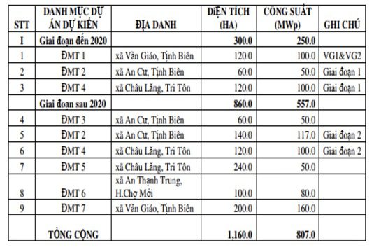 Trong giai đoạn đến 2020, diện tích đất cần khoảng 300ha, tương ứng với tổng công suất lắp đặt là 250MWp; giai đoạn sau 2020, diện tích đất cần khoảng 860ha, tuơng ứng với công suất lắp đặt là 557MWp. Cụ thể, trên địa bàn huyện Tịnh Biên gồm các xã có tiềm năng như An Cư, Văn Giáo, An Hảo với tổng công suất tiềm năng khai thác 580 MWp; huyện Tri Tôn với các xã Châu Lăng, Núi Tô, An Tức có tiềm năng khai thác 253 MWp; huyện Châu Thành với xã Cần Đăng có tiềm năng khai thác 67 MWp; huyện chợ Mới với xã An Thạnh Trung có tiềm năng khai thác 90 MWp. Còn lại, tiềm năng phát triển nguồn năng lượng mặt trời trên mái nhà.
