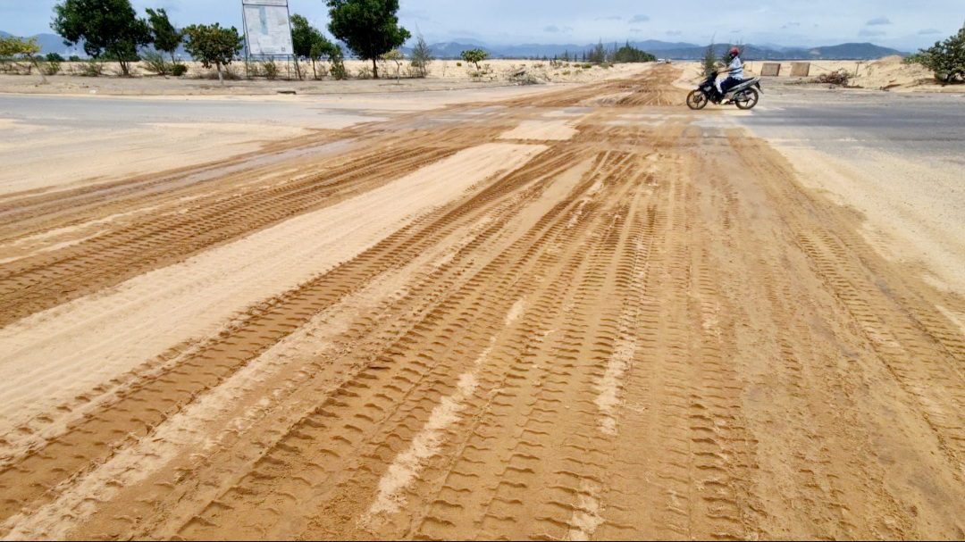 Cát rơi rãi xuống đường cả một đoạn đường,dầy từ 3cm đến 5cm, các xe qua lại rất dễ trượt, xìa ngã nguy cơ tai nạn giao thông cao,