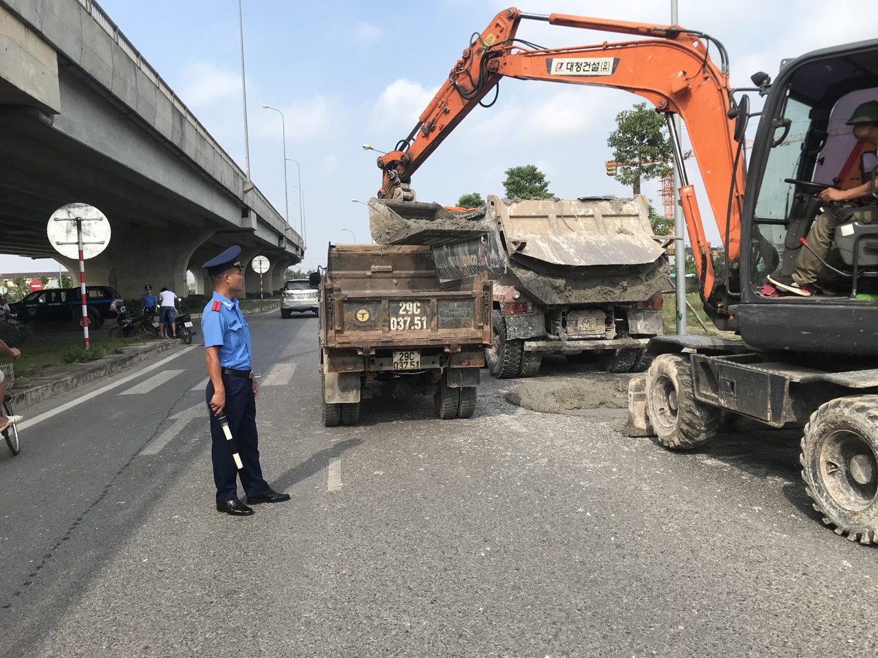 Mới đây nhất sáng ngày 23 tháng 10, trên đường Võ Nguyên Giáp chiều từ sân bay Nội Bài về trung tâm Hà Nội, một chiếc xe ben chở bê tông tươi đã bị tụt ben làm bê tông trút xuống mặt đường gây cản trở giao thông nghiêm trọng. Trong khi chờ phương tiện xe ủi, máy xúc của lực lượng chức năng dọn. Lực lượng TTGT huyện Đông Anh phối hợp với CSGT đội 15 – phòng CSGT công an TP. Hà Nội đã nhanh trí vừa phân luồng giao thông vừa dùng các phương tiện thô sơ như cuốc xẻng thu gom bê tông chờ xe chuyên dụng đến xử lý. Ông Lê Quang Vinh, đội trưởng đội TTGT huyện Đông Anh cho biết:”nếu không kịp thời thu gom, bê tông sẽ đông cứng lại gây nguy hiểm và ách tắc kéo dài nên anh em phản ứng nhanh để đảm bảo an toàn giao thông vì đây là con đường cao tốc huyết mạch nối sân bay với trung tâm thủ đô”.