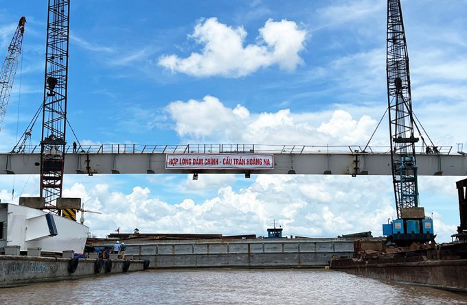 Ngày 26/8 vừa qua, công trình cầu Trần Hoàng Na đã tiến hành hợp long đoạn dầm dọc bằng thép cuối cùng dài 53m (nặng 150 tấn). Hiện đơn vị thi công đang lắp đặt các dầm dọc và ngang, sẽ hợp long phần mái vòm lần hai và 3 vào trung tuần tháng 9 tới.