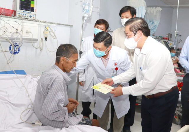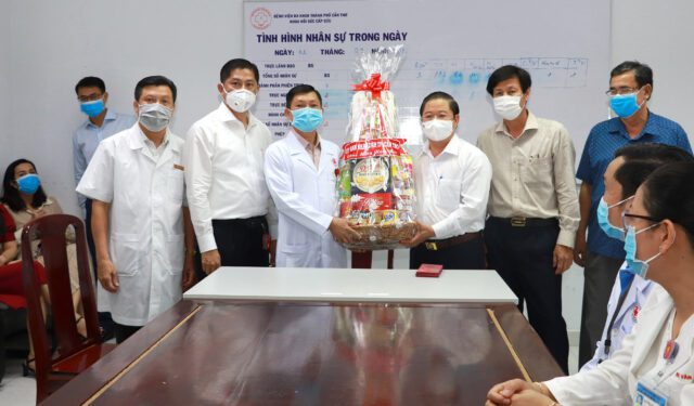 Chiều 12/2, Mồng Một Tết, Chủ tịch UBND thành phố Cần Thơ Trần Việt Trường đến thăm một số người bệnh có hoàn cảnh khó khăn tại Bệnh viện Đa khoa thành phố và chúc Tết các thầy thuốc đang trực phòng chống dịch bệnh.