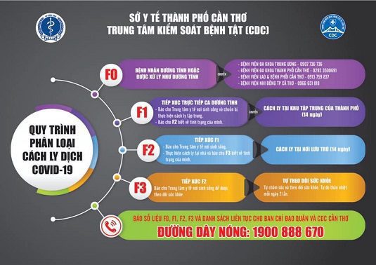 Cụ thể, F0 là bệnh nhân dương tính hoặc được xử lý như dương tính. Những người này được đưa đi điều trị một trong 4 cơ sở sau: Bệnh viện Đa khoa Trung ương Cần Thơ có số điện thoại 0907736736; Bệnh viện Đa khoa TP Cần Thơ điện thoại 02923500691; Bệnh viện Lao – Phổi TP Cần Thơ điện thoại 0913759837; Bệnh viện Nhi TP Cần Thơ điện thoại 0966651818.