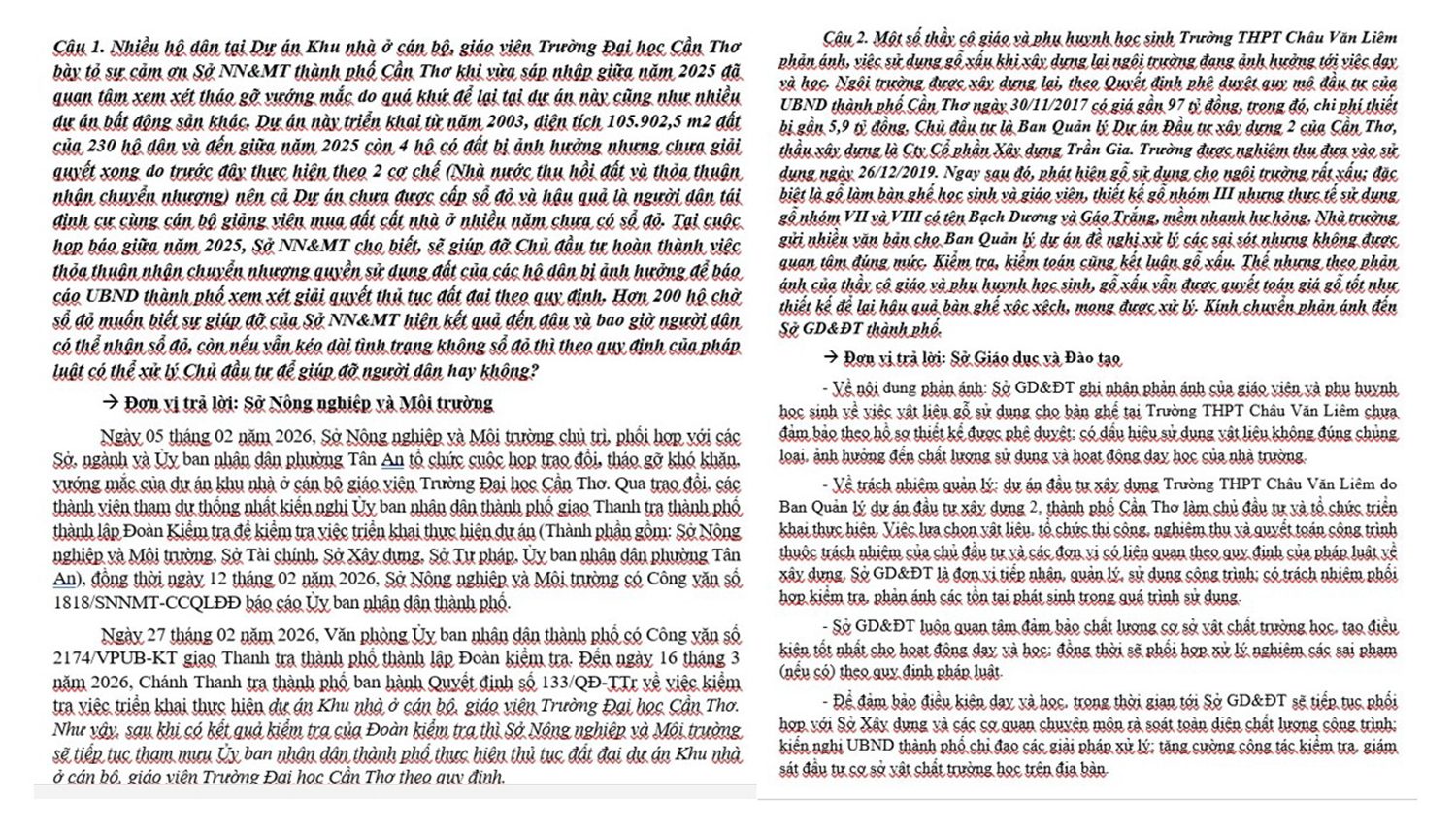 Thành phố Cần Thơ tổ chức họp báo định kỳ quý I vào ngày 14/4/2026, các sở ban ngành đã quan tâm trả lời đầy đủ câu hỏi của phóng viên đặt ra bằng văn bản và được Sở VHTT&DL tổng hợp. Sau đây là trả lời của Sở NN&MT, Sở GD&ĐT về 2 câu hỏi liên quan đến trường học.