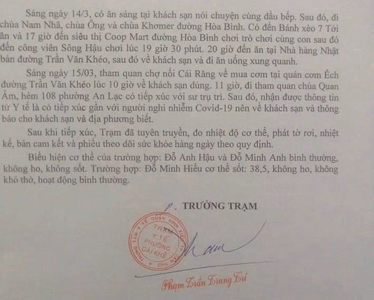 Ba người vào Cần Thơ thuê khách sạn nghỉ ở phường Cái Khế, quận Ninh Kiều nên hành trình tiếp xúc được Trạm Y tế phường Cái Khế làm rõ và Trưởng trạm Phạm Trần Trung Trí đã ký báo cáo chiều 15/3. “Báo cáo về trường hợp tiếp xúc gần với người nghi nhiễm Covid-19 phường Cái Khế” cho biết, ba người đều là nam giới sinh năm 1988, 2011 và 2013 thường trú phường Bồ Đề (Long Biên, Hà Nội). Chiều 9/3, họ bay từ Hà Nội vào TP Hồ Chí Minh về nhà nội ở một chung cư tại phường 21, quận Bình Thạnh cho đến chiều 13/3, thuê xe tự lái về Cần Thơ.