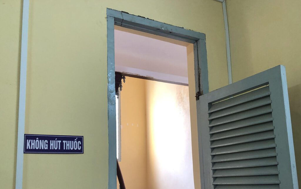Tại cửa gỗ bị mối ăn hơn 80%, thiết kế gỗ căm xe (nhóm II) nhưng kiểm định khung bao cửa là gỗ thao lao (nhóm III), khung bảo vệ méo mó. Các lá sách cửa bị nứt, vỡ, không bào và số lá sách ít hơn thiết kế nên thưa. Cánh cửa không tạo rãnh âm dương mà lắp thêm thanh nẹp che giữa hai cánh, các thanh này không chắc, bị bong nhiều nên cửa xộc xệch. Tại khu hiệu bộ nhà trường, ngoài cửa bị mối ăn nát bị rơi xuống, kiểm tra phát hiện thêm 2 cửa khác cũng bị mối ăn.