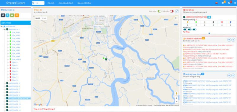 Giám sát theo dõi tình trạng hệ thống: người dùng có thể theo dõi trạng thái hoạt động các tủ điều khiển thông minh, các bộ đèn LED trên bản đồ số theo thời gian thực