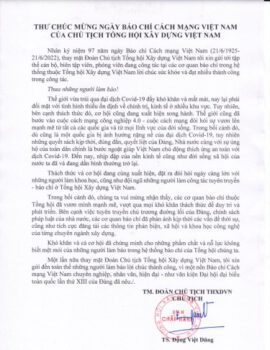 Nhân kỷ niệm 97 năm Ngày Báo chí Cách mạng Việt Nam (21/6/1925 – 21/6/2022), TS. Đặng Việt Dũng – Chủ tịch Tổng hội Xây dựng Việt Nam đã gửi thư chúc mừng đến cán bộ, phóng viên, BTV đang hoạt động trong hệ thống Tổng Hội Xây dựng Việt Nam lời chúc sức khỏe và thành công trong công tác.
