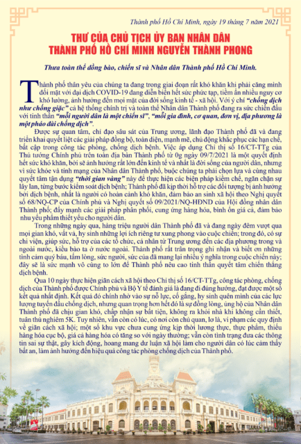 Trong những ngày qua, hàng triệu người dân Thành phố đã và đang ngày đêm vượt qua mọi gian khó, vất vả, hy sinh những lợi ích riêng tư xung phong vào cuộc chiến; trong đó, có sự chi viện, giúp sức, hỗ trợ của các tổ chức, cá nhân từ Trung ương đến các địa phương trong và ngoài nước, kiều bào ta ở nước ngoài. Thành phố rất trân trọng ghi nhận và biết ơn những tình cảm quý báu, tấm lòng, sức người, sức của đã mang lại nhiều ý nghĩa trong cuộc chiến này; đây sẽ là sức mạnh vô cùng to lớn để Thành phố nêu cao tinh thần quyết tâm chiến thắng dịch bệnh.