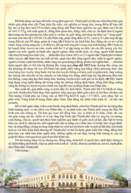 Để có thể ngăn chặn, kiểm soát thành công dịch bệnh, sớm đưa Thành phố trở lại trạng thái bình thường mới, vì sức khỏe của Nhân dân, vì sự phát triển của Thành phố mang tên Bác Hồ kính yêu của chúng ta, Tôi kêu gọi toàn thể đồng bào, các vị nhân sĩ trí thức, chức sắc các tôn giáo cùng cán bộ, chiến sĩ và các tầng lớp Nhân dân Thành phố tiếp tục ủng hộ, tin tưởng, cảm thông, chia sẻ, quyết tâm thực hiện nghiêm quy định về giãn cách xã hội, đặc biệt là trong khu vực cách ly, phong tỏa, mỗi người dân cần tự nâng cao ý thức bảo vệ mình, bảo vệ gia đình, bảo vệ cộng đồng; chúng ta cùng chấp nhận hy sinh lợi ích trước mắt và một số bất tiện, khó khăn hơn so với điều kiện bình thường để Thành phố có thể ổn định, phát triển bền vững; đồng thời phát huy cao nhất tinh thần nghĩa tình, những nghĩa cử cao đẹp, tương thân tương ái, san sẻ, giúp đỡ nhau vượt qua được giai đoạn khó khăn này.