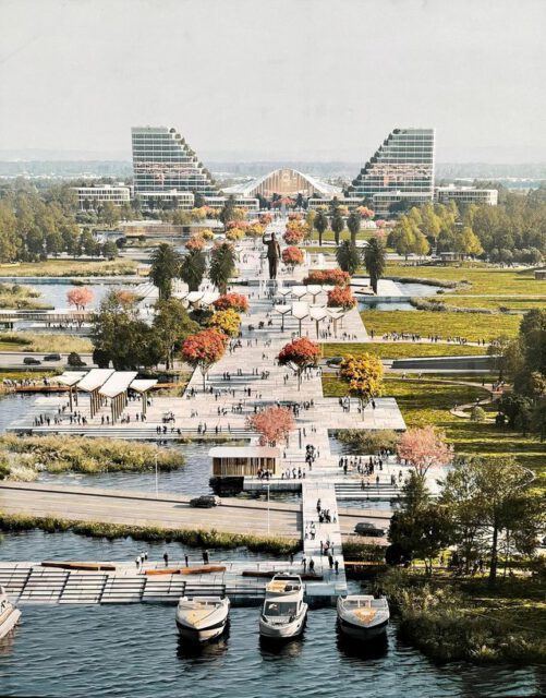 Khu cảnh quan mặt nước bố trí công viên và bến thuyền dọc ven sông Cấm tạo không gian mở và khai thác cảnh quan mặt nước. Đồng thời, các công trình văn hóa sẽ được bố trí gần trung tâm thương mại để tạo không gian sống động, gần gũi.