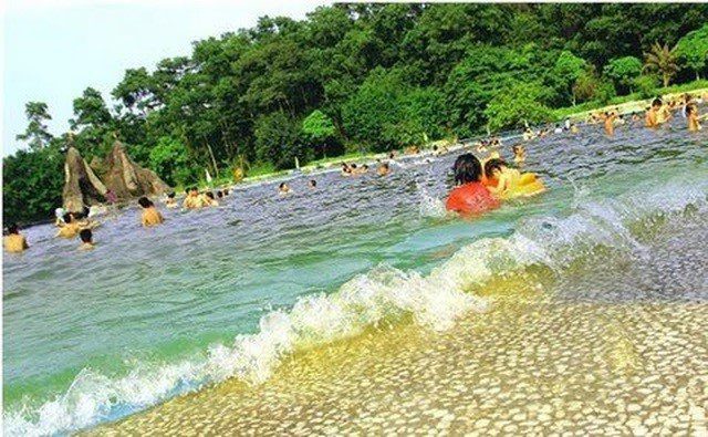 Đến với khu du lịch Khoang Xanh – Suối Tiên, Du khách không chỉ được hòa mình vào không khí trong lành của núi rừng mà còn có cảm giác mình đang được hưởng không khí của biển cả với “Hồ tạo sóng”. Nằm trên diện tích 3.500m2, Hồ tạo sóng được cung cấp nguồn nước trong vắt từ đỉnh núi Tản Viên, không sử dụng hóa chất. Vì nước của hồ bơi hoàn toàn là nước suối tinh khiết nên lúc nào cũng mát và được thay nước liên tục. Các bé có một khu vực bơi nhỏ hơn bên cạnh với độ sâu ít hơn hồ bơi cho người lớn để các bé tha hồ nghịch nước bơi lội mà không sợ nguy hiểm. Với hệ thống máy tạo sóng hiện đại, sóng trong hồ cao hơn nửa mét khiến du khách có cảm giác như đang tắm ở biển. Ngoài ra, nơi đây còn có hệ thống phun nước hiện đại có nhiều trò chơi hấp dẫn như du thuyền, trượt nước, đu quay sao chổi, bắn nỏ phi tiêu, vườn cổ tích và bể vầy dành cho thiếu nhi… Hồ tạo sóng đang là địa điểm du lịch đông khách nhất ở Khoang Xanh Suối Tiên mỗi ngày.