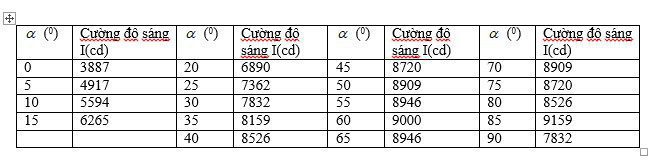 Đối với đèn LED: Cách tính cũng giống như đối với đèn M-H nhưng chú ý rằng, cường độ sáng theo các phương khác nhau là khác nhau. Căn cứ vào file ies ta lập được bảng phân bố cường độ sáng theo góc của đèn LED trên mặt nước (Bảng 1)