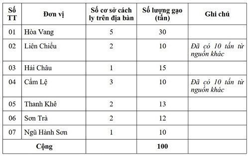 Uỷ ban MTTQ Việt Nam TP Đà Nẵng đề nghị Ban Thường trực Ủy ban MTTQ Việt Nam các quận, huyện cung cấp kịp thời gạo cho các cơ sở cách ly trên địa bàn khi có yêu cầu; đồng thời, phối hợp với UBND các quận, huyện nắm bắt tình hình các hộ dân gặp khó khăn do ảnh hưởng dịch Covid-19 và phân bổ số lượng gạo về cho các phường, xã, với số lượng mỗi hộ dân nhận 10 kg gạo.
