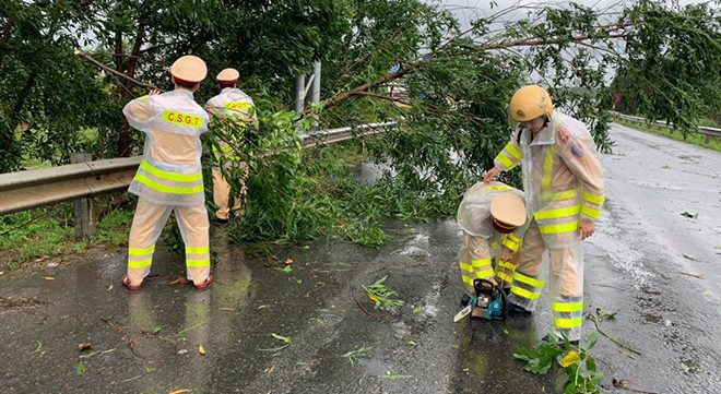Sáng 28/10/2020, tại tuyến đường tránh nam Hải Vân – Túy Loan, một số cây xanh đã ngã đổ, gây ách tắt giao thông. Vì vậy, cán bộ, chiến sĩ CSGT- Trạm cửa ô Hòa Nhơn (Phòng CSGT, CATP Đà Nẵng) triển khai lực lượng đến để dọn dẹp, thông tuyến để các phương lưu thông bảo đảm ATGT.