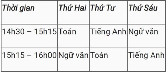 Theo đó, chương trình sẽ có 3 số phát sóng mỗi tuần, mỗi số là 2 môn học với thời lượng 45 phút/môn. Cụ thể như sau: