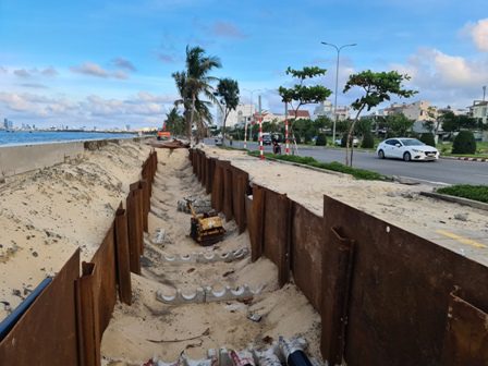 Theo ghi nhận tại dự án trên, hiện đang trong quá trình thi công, nhiều đoạn vỉa hè được đào thành mương, hố, có chiều dài từ trên chục mét đến vài chục mét, có bề rộng gần 3m, sâu trên dưới 2,5m, được gia cố hai bên mương hố bằng thanh thép chữ U và tấm thép, để lộ thiên trên mặt vỉa hè đường, trên dưới 0,5 m và hầm nối cáp điện cũng đang trong quá trình thi công để lộ thiên nhưng thanh sắt chờ, để đổ bê tông.