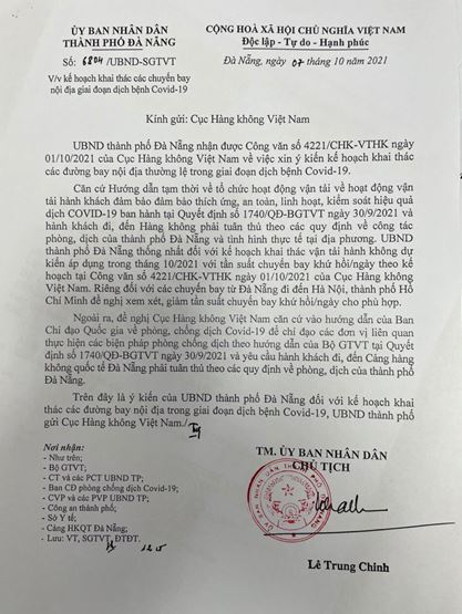 Đồng thời, Chủ tịch TP Lê Trung Chinh cũng có công văn phúc đáp gửi Cục này là UBND TP Đà Nẵng thống nhất với kế hoạch khai thác vận tải hàng không dự kiến áp dụng trong tháng 10-2021 với tần suất chuyến bay khứ hồi/ngày theo kế hoạch tại Công văn số 4221 của Cục Hàng không Việt Nam. Riêng đối với các chuyến bay từ Đà Nẵng đi đến Hà Nội, TP.HCM đề nghị xem xét, giảm tần suất chuyến bay khứ hồi/ngày cho phù hợp.