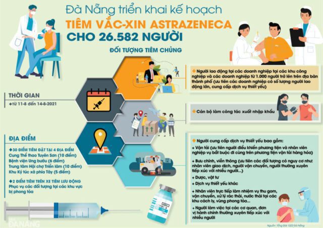 Từ 11-14/8/2021. Sở Y tế TP Đà Nẵng bắt đầu triển khai tiêm vắc-xin phòng Covid-19 AstraZeneca mũi 1 cho 26.582 người, sau khi tiêm mũi 2 với hơn 8.000 mũi cho đối tượng là những người tuyến đầu, cơ quan báo chí.