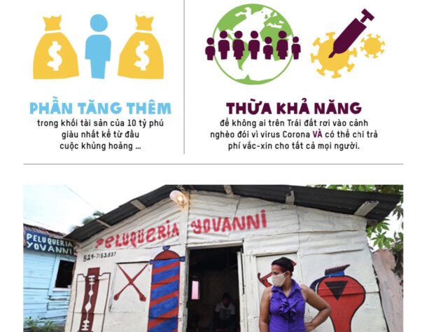 1/Những người giàu nhất đã vượt qua giai đoạn suy thoái. Tổng giá trị tài sản của 10 người giàu nhất thế giới đã tăng thêm 540 tỷ đô-la Mỹ kể từ khi bắt đầu đại dịch – thừa khả năng trả tiền vắc-xin COVID-19 cho tất cả mọi người và đảm bảo không ai bị đẩy vào cảnh nghèo đói vì đại dịch. Đồng thời, đại dịch cũng châm ngòi cho cuộc khủng hoảng việc làm tồi tệ nhất trong hơn 90 năm qua, với hàng trăm triệu người hiện đang thiếu hoặc không có việc làm.