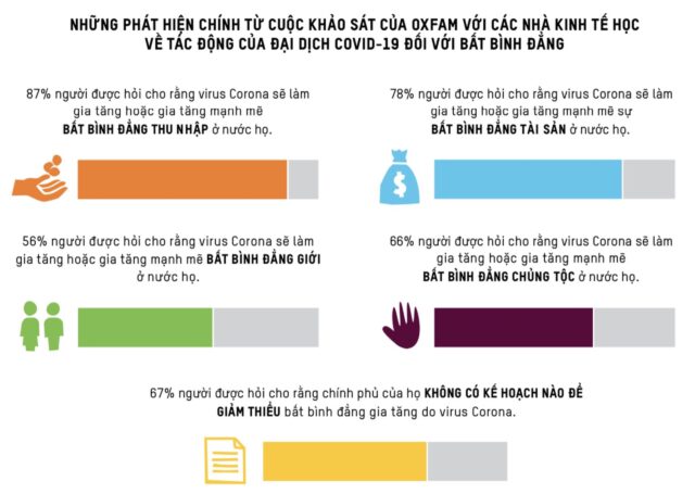 Một khảo sát toàn cầu mới của Oxfam với 295 nhà kinh tế học đến từ 79 quốc gia cho thấy, 87% người được hỏi, bao gồm Jeffrey Sachs, Jayati Ghosh và Gabriel Zucman, dự đoán rằng bất bình đẳng thu nhập ở nước họ sẽ ‘tăng’ hoặc ‘tăng mạnh’ do hậu quả của đại dịch. Báo cáo của Oxfam chỉ ra rằng hệ thống kinh tế bị thao túng đang cho phép tầng lớp thượng lưu siêu giàu tích lũy tài sản giữa tâm điểm của cuộc suy thoái tồi tệ nhất sau Đại Suy thoái, trong khi hàng tỷ người đang phải vật lộn để kiếm sống. Đại dịch đang làm trầm trọng thêm tình trạng chia rẽ về kinh tế, chủng tộc và giới vốn đã tồn tại từ lâu.