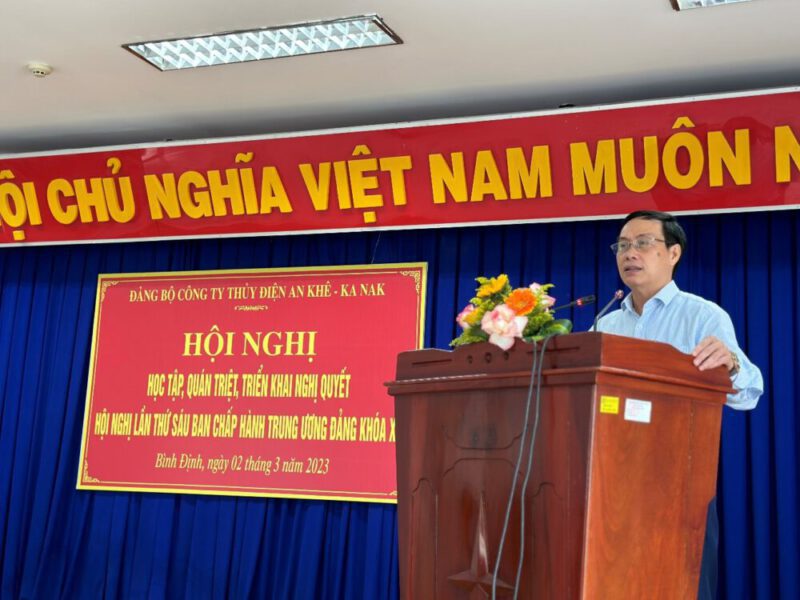 Nhằm giúp cấp ủy, chính quyền, tổ chức đoàn thể các cấp và mỗi cán bộ, đảng viên nắm vững những nội dung cốt lõi, những điểm mới trong các văn kiện Hội nghị lần thứ sáu Ban Chấp hành Trung ương Đảng khóa XIII, từ đó xây dựng kế hoạch thực hiện để cụ thể hóa Nghị quyết phù hợp với tình hình, đặc điểm từng đơn vị, cá nhân đưa Nghị quyết vào cuộc sống nhanh chóng, hiệu quả, ngày 02/03/2023, Đảng ủy Công ty Thủy điện An Khê – Ka Nak đã tổ chức Hội nghị học tập, quán triệt Nghị quyết Hội nghị lần thứ sáu Ban chấp hành Trung ương Đảng khóa XIII.