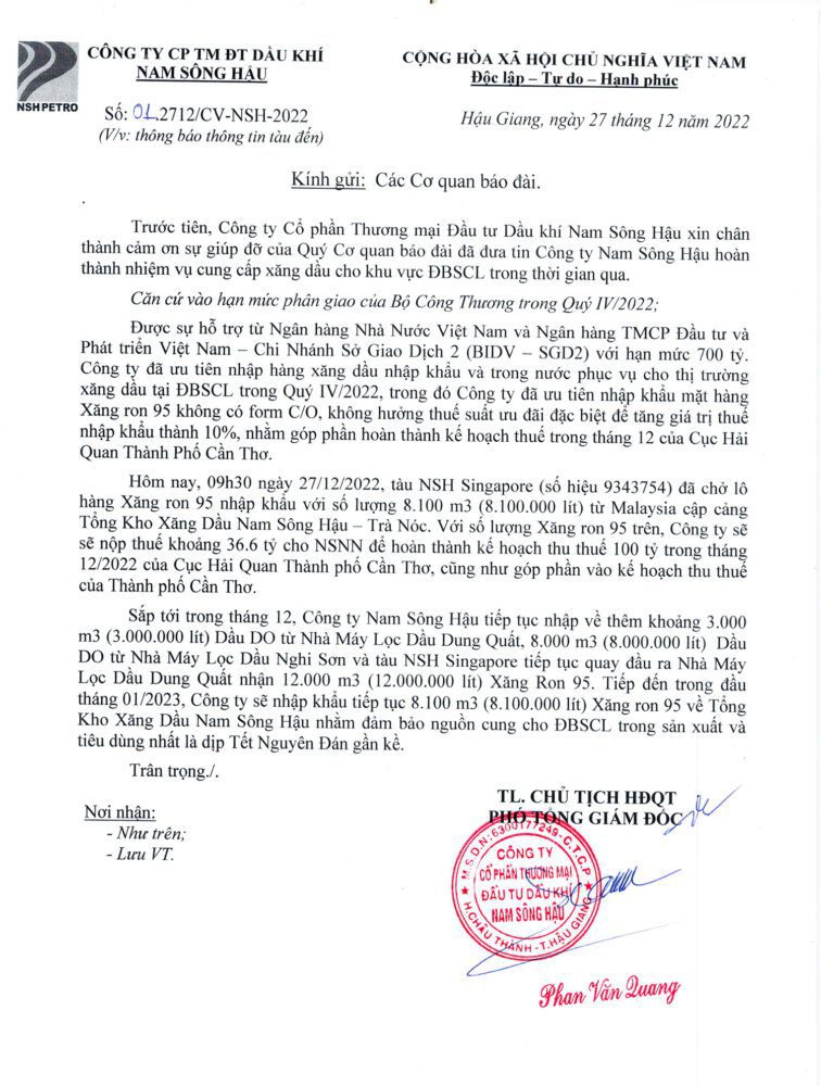 Công văn số 012712/CV-NSH-2022 ngày 27/12/2022 do Phó tổng giám đốc Công ty Phan Văn Quang ký. Nội dung cho biết căn cứ vào hạn mức phân giao của Bộ Công Thương trong Quý IV/2022; được sự hỗ trợ từ Ngân hàng Nhà nước và Ngân hàng TMCP Đầu tư và Phát triển Việt Nam – Chi Nhánh Sở Giao dịch 2 với hạn mức 700 tỷ đồng, Công ty đã ưu tiên mua xăng dầu phục vụ thị trường dịp Tết. Trong đó, Công ty ưu tiên nhập khẩu xăng ron 95 không có form C/O, không hưởng thuế suất ưu đãi đặc biệt để tăng giá trị thuế nhập khẩu thành 10%, nhằm góp phần hoàn thành kế hoạch thuế trong tháng 12 của Cục Hải quan thành phố Cần Thơ.