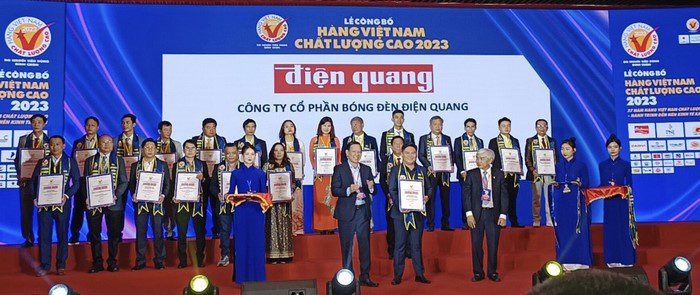 Tại Lễ công bố và trao chứng nhận Doanh nghiệp Hàng Việt Nam chất lượng cao năm 2023 diễn ra vào ngày 14/3 tại TP.HCM, Điện Quang tiếp tục là đơn vị dẫn đầu ngành chiếu sáng, điện, gia dụng được người tiêu dùng yêu thích bình chọn. Đây là năm thứ 27 liên tiếp Điện Quang nhận được danh hiệu cao quý này.