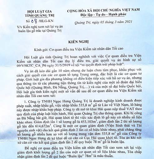 Ngày 08/7/2021 Đoàn Đại biểu Quốc hội (ĐBQH) tỉnh Quảng Trị gửi Công văn số 65/ĐĐBQH đến các cơ quan của Quốc hội “Kiến nghị giám sát vụ án buôn lậu gỗ trắc”. Trước đó, ngày 05/3/2021, Hội Luật gia tỉnh Quảng Trị có Công văn số 68/HLG-KN gửi Cơ quan điều tra VKSND Tối cao “Kiến nghị xem xét lại vụ án buôn lậu gỗ trắc”. Các công văn cũng được chuyển tới Tạp chí Ánh Sáng và Cuộc Sống để thông tin tới bạn đọc những vấn đề dư luận quan tâm nhiều năm qua.