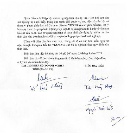 Biên bản làm việc với Đoàn ĐBQH tỉnh Quảng Trị cho biết: “Đoàn ĐBQH tỉnh Quảng Trị cung cấp cho Cơ quan điều tra VKSND tối cao các tài liệu thế hiện kết quả giám sát mà Đoàn ĐBQH đã thực hiện và các tài liệu có liên quan đến vụ án mà Đoàn đã thu thập được. Đoàn ĐBQH tỉnh Quảng Trị kiến nghị Cơ quan điều tra VKSND tối cao làm rõ vi phạm và xử lý vụ việc theo quy định của pháp luật; đồng thời đề nghị Cơ quan điều tra xem xét dấu hiệu oan, sai để báo cáo cấp có thẩm quyền kháng nghị giám đốc thẩm đối với bản án”. Biên bản làm việc với Hiệp hội Doanh nghiệp tỉnh Quảng Trị ghi 4 vấn đề bức xúc của Hiệp hội: Thứ nhất, vật chứng là căn cứ rất quan trọng để cơ quan tiến hành tố tụng tiến hành điều tra, truy tố, xét xử đối với vụ án hình sự nhưng ngay trong giai đoạn điều tra, Cơ quan CSĐT Bộ Công an đã bán toàn bộ lô gỗ là vật chứng của vụ án, gây ảnh hưởng trực tiếp đến việc đánh giá bản chất và tính khách quan của vụ án. Bán trái phép lô gỗ như vậy có tồn tại động cơ vụ lợi gì hay không? Thứ hai, theo thông lệ của các nước trong khu vực ASEAN và Trung Quốc thì quy đổi trọng lượng, khối lượng gỗ Trắc là 1.300 kg = 1 m3 nhưng với vụ án này thì cơ quan tiến hành tố tụng quy đổi 1.000 kg = 1 m3 là bất hợp lý. Thứ ba, chính sách buôn bán gỗ giữa Lào và Việt Nam thời điểm năm 2011 là bình thường, doanh nghiệp Việt Nam nhập khẩu gỗ chỉ chịu trách nhiệm từ cửa khẩu trở vào Việt Nam. Thứ tư, Cty TNHH Ngọc Hưng nhập khẩu gỗ ngày 17/12/2011 với 535,8 m3 bị coi là “buôn lậu”; còn ngày 18/12/2011 nhập 538 m3 thì được xác định là không vi phạm, trả lại cho Cty TNHH Ngọc Hưng để xuất đi Trung Quốc. |