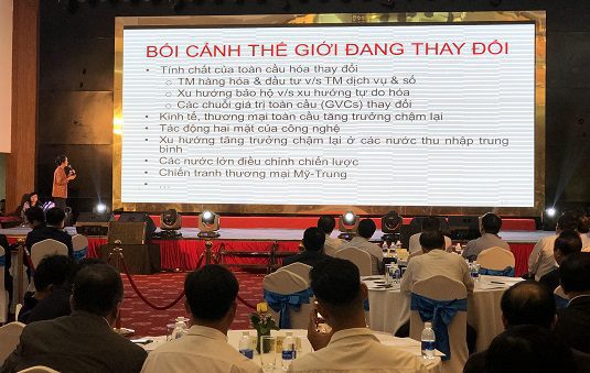 Bà Phạm Chi Lan dẫn phân tích của Ngân hàng Thế giới: Tính chất của toàn cầu hóa đang thay đổi, dòng chảy thương mại và đầu tư chậm lại. Các chuỗi giá trị toàn cầu đã chín muồi dẫn tới thách thức các chiến lược xuất khẩu và tăng trưởng dựa trên công nghiệp chế tạo nhờ lao động giá rẻ.