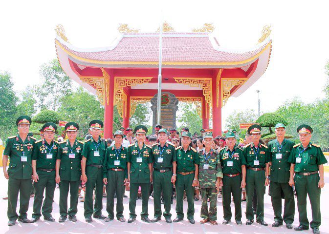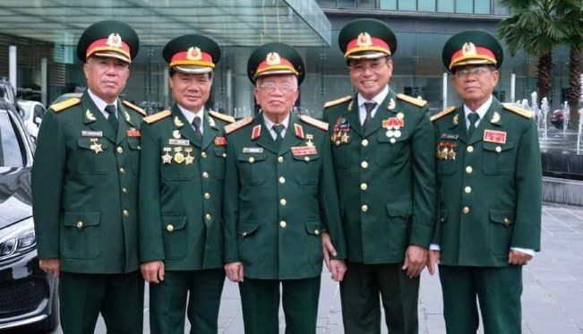 Cựu chiến binh Lê Mạnh Hải (bên trái, đeo kính) cùng Trung tướng Khuất Duy Tiến, nguyên Tư lệnh Quân đoàn 3 thăm Sa Thầy (Kon Tum) năm 2018.