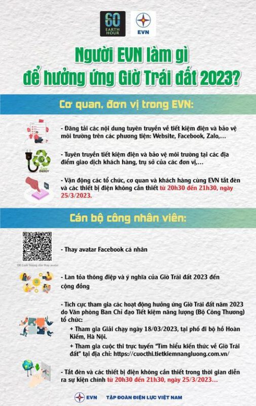 Tập đoàn Điện lực Việt Nam cũng vận động các cán bộ công nhân viên tham gia giải chạy hưởng ứng Chiến dịch Giờ Trái đất 2023; tham gia cuộc thi tìm hiểu Giờ Trái đất trực tuyến do Văn phòng Ban Chỉ đạo tiết kiệm năng lượng (Bộ Công Thương) tổ chức; tham gia một số hoạt động tuyên truyền nâng cao nhận thức cho cộng đồng về cách sử dụng tiết kiệm năng lượng…