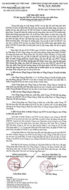 Thể hiện tinh thần chung tay cùng nhau vượt qua khó khăn và phát huy vai trò, truyền thống của ngành điện, Tổng Giám đốc Tập đoàn Điện lực và Ban thường vụ Công đoàn Điện lực Việt Nam đã phát động lời kêu gọi giúp đỡ, hỗ trợ cán bộ, công nhân viên EVN tại khu vực miền Nam bị ảnh hưởng bởi dịch bệnh Covid-19.