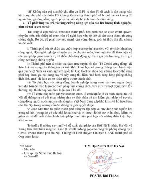 Ngày 30/8/2021, Hội Nữ trí thức Hà Nội và Trung tâm Phát triển Sáng tạo Xanh (GreenID) – trực thuộc Liên hiệp các Hội khoa học và Kỹ thuật Việt Nam-VUSTA gửi thư bày tỏ sự ủng hộ tuyệt đối với chủ trương đang triển khai của UBND thành phố Hà Nội và góp ý thực hiện “mỗi tổ dân phố là một pháo đài phòng chống dịch Covid hiệu quả”.