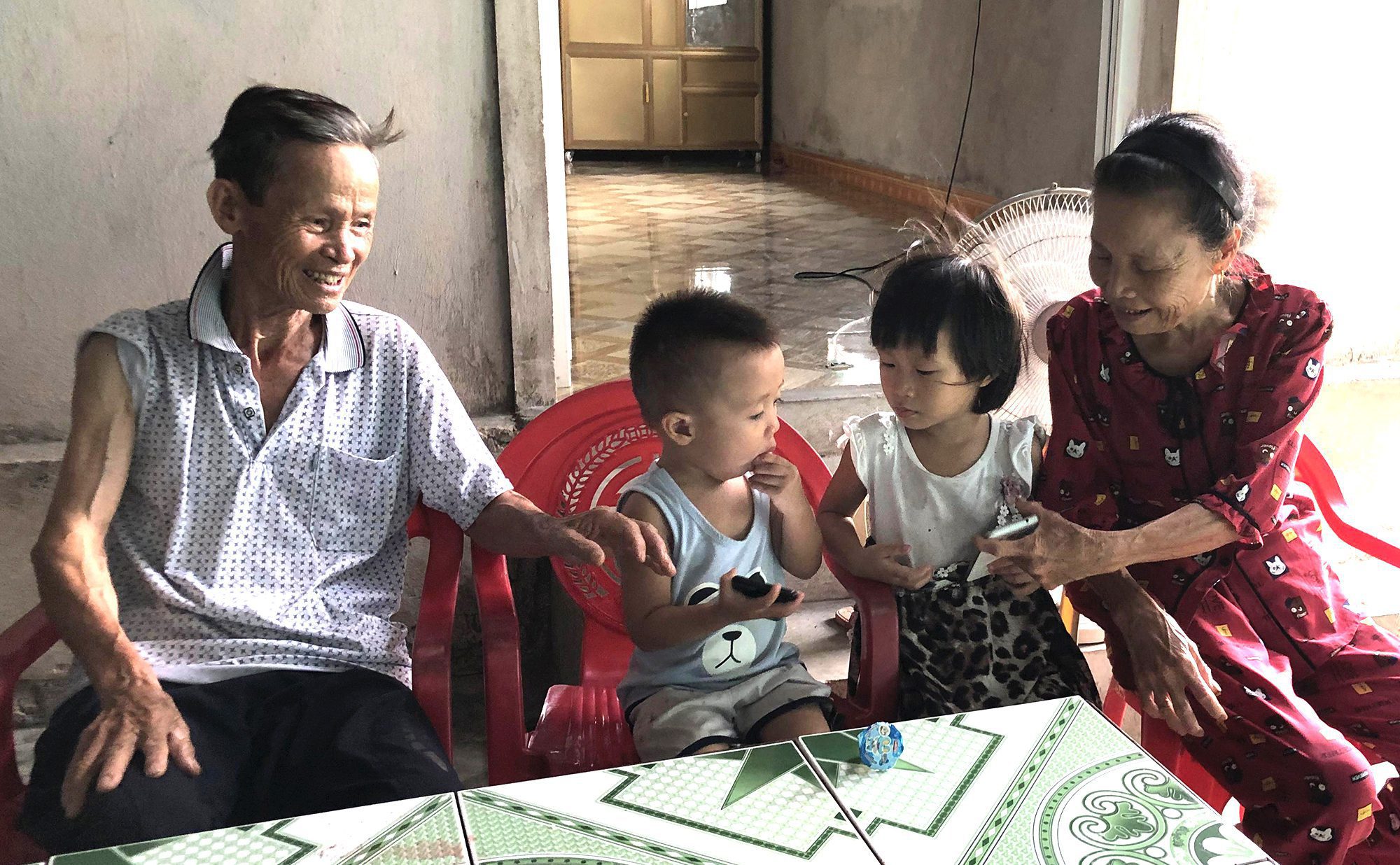 Tôi đến nhà anh nuôi là cán bộ hưu trí Lê Khắc Thạnh 75 tuổi, thấy hai đứa cháu nội lên 3 và 4 tuổi đang giành nhau chiếc điện thoại, khóc inh ỏi. Vợ anh 67 tuổi vừa dỗ cháu vừa kể, chúng giành nhau cái điện thoại có trò chơi Nàng Tiên Cá. Còn anh than khổ nuôi con rồi nuôi cháu vì cha mẹ chúng long đong xứ người. Anh Thạnh kể, con trai đi Đài Loan 3 năm được 300 triệu đồng về cất căn nhà, đi tiếp sang Singapore 4 tháng lỗ 100 triệu đồng về bán ruộng trả nợ, đi Malaysia gần năm được 30 triệu đồng về làm mái che sân; lại theo bạn bè đi Đức làm nghề sơn móng tay nhưng vụng về nên đi tiếp sang Anh chẳng may gặp bọn cướp trấn lột. Còn con dâu đi Đài Loan chăm người già, công việc khá ổn nhưng nghe bạn bè trốn ra ngoài nên bị bắt và nay vẫn lận đận. “Vợ chồng tôi tuổi già phải nuôi con cho chúng đi chăm người già xứ người, giờ chỉ mong trả được 700 triệu đồng vay lo cho chúng khi đi”, anh Thạnh nở nụ cười buồn.