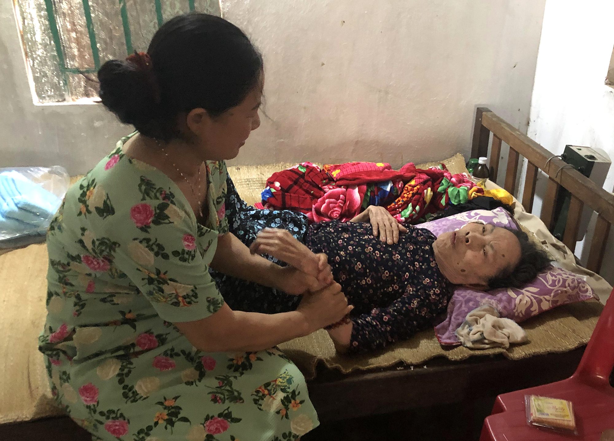 Chị đầu của tôi là Phạm Thị Đam năm nay 83 tuổi, có đông con cháu nhưng hơn năm nay nằm liệt giường phải nhờ xóm giềng chăm sóc, bởi con cháu sinh sống bốn phương. Bệnh thoái hóa xương chứ đầu óc chị còn minh mẫn, chị vanh vách kể tên 14 đứa con và cháu đang sống ở Đức, Anh. Trong đó, con gái Thái Thị Đẹp sang Đức hơn chục năm, lấy chồng và sinh 3 đứa con ở bên. Con trai duy nhất cũng sang Đức đã 5 năm. Chị nói, con cháu gửi tiền về thuê người chăm sóc chị chu đáo, có sâm uống và nệm hơi nằm điều chỉnh căng xẹp phù hợp thời tiết, “thương chúng ở quê nghèo phải đi xa tìm kiếm tương lai”.