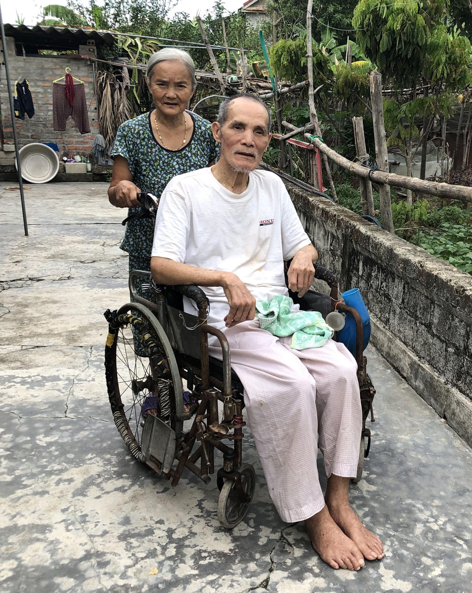 Buồn không kém là anh con cậu của tôi, thương binh Nguyễn Đình Yên 80 tuổi, ngồi xe lăn 9 năm nay nhưng đang phải cùng vợ 75 tuổi nuôi đứa cháu ngoại, vì mẹ nó bỏ chồng và đi Đài Loan. Anh chị cũng đông con cháu nhưng hầu hết ở xứ người. Con gái đầu đi Đài Loan 3 năm mới về; trai út thì vợ ở Hàn Quốc, 2 con ở Đài Loan. Vất vả nhất là con trai đầu Nguyễn Đình Sơn, hồi đi Đài Loan bị tai nạn cháy mặt nhăn nhúm, ngón tay co quắp nhưng vẫn phải long đong xứ người kiếm sống để nuôi vợ với 2 con ở nhà. “Lương thương binh của anh một tháng được 1,1 triệu đồng, chị phải lo rau khoai trong vườn mới đủ qua ngày. Anh ngồi một chỗ, ngày đêm cầu mong con cháu phương xa chân cứng đá mềm”, anh Yên rơm rớm nước mắt.