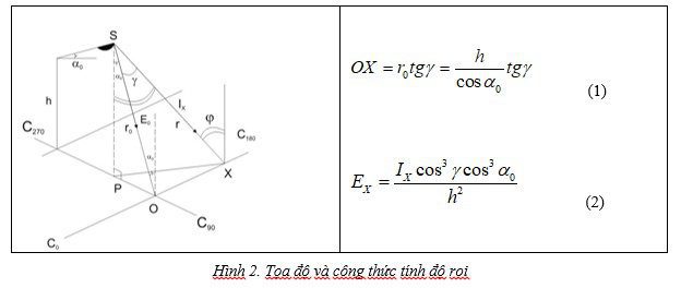 Tọa độ và độ rọi tại một điểm trên mặt đường được tính theo các công thức (1) và (2) theo hình 2