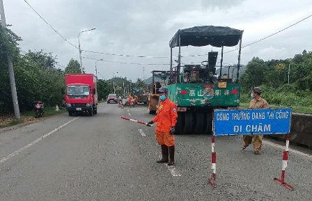 Công ty cổ phần Quản lý và xây dựng đường bộ Khánh Hòa đang tiến hành sữa chữa ở Km 1437+943 (Cát Lợi, TP.Nha Trang, Khánh Hòa)