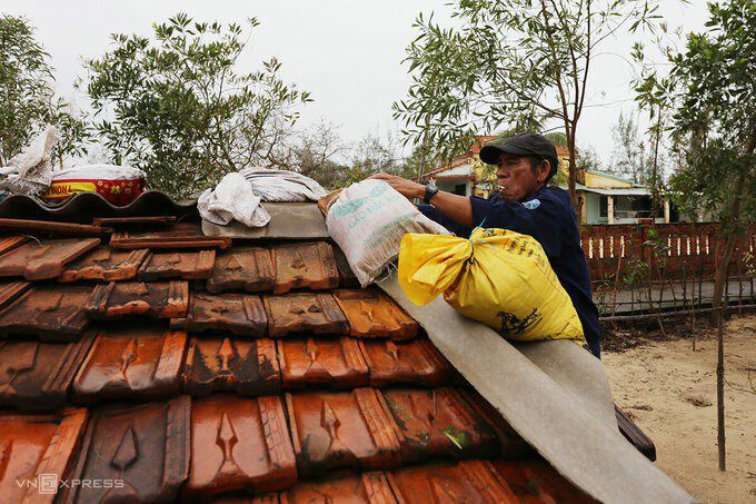 Trưa 14/11, các thành viên trong gia đình ông Tuấn đến trạm y tế xã trú bão. “Chưa có năm nào như năm nay, mưa kéo dài, bão xuất hiện liên tục”, ông Tuấn nói. Hiện, mái nhà của ông đã neo chặt, hàng chục bao tải đựng cát được đặt lên trên.