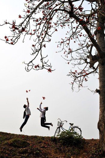 Khi cái rét nàng Bân làm tê tái lòng người, khi những đợt mưa bụi cuối xuân làm cho những con đường đất trong làng nhão nhoét, lầy lội và trơn tuột, khi những cánh hoa xoan li ti màu tim tím nở, đưa hương ngan ngát là lúc những chùm hoa gạo bung ra, đỏ rực như một đài lửa khổng lồ làm sáng bừng cả đường làng ngõ xóm. Hoa gạo là tín hiệu của đất trời báo cho muôn loài biết rằng đất trời đã chuyển từ mùa xuân mùa của yêu đương sang mùa hạ mùa của đơm hoa kết trái.
