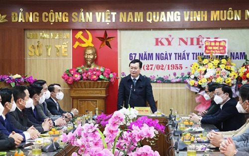 Tại Sở Y tế, Chủ tịch UBND tỉnh Nguyễn Đức Trung đã gửi lời chúc tốt đẹp nhất đến tập thể cán bộ, y, bác sĩ, người lao động toàn ngành Y tế Nghệ An nhân dịp kỷ niệm 67 năm Ngày Thầy thuốc Việt Nam. Chủ tịch UBND tỉnh ghi nhận và biểu dương những thành tích của đội ngũ cán bộ, y, bác sỹ, người lao động toàn ngành đã đạt được trong năm qua, nhất là công tác phòng chống dịch COVID-19. Diễn biến dịch COVID -19 trên địa bàn tỉnh cũng như cả nước trong thời gian qua rất phức tạp, khó lường với số lượng ca nhiễm mỗi ngày hơn hai nghìn trường hợp, tạo áp lực rất lớn về công tác điều trị, chăm sóc bệnh nhân…