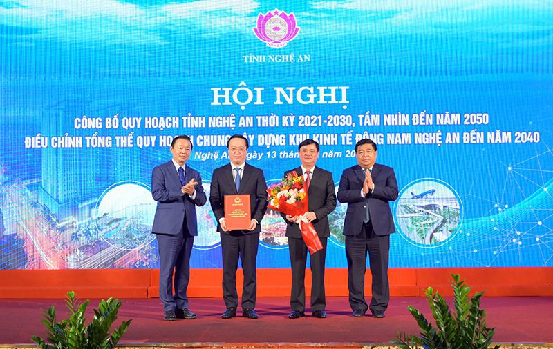 Tiếp đó, Phó Thủ tướng Chính phủ Trần Hồng Hà và Bộ trưởng Bộ KH&ĐT Nguyễn Chí Dũng đã trao Quyết định số 1059/QĐ-TTg ngày 14/9/2023 của Thủ tướng Chính phủ về phê duyệt Quy hoạch tỉnh Nghệ An thời kỳ 2021 – 2030, tầm nhìn đến năm 2050 cho lãnh đạo tỉnh Nghệ An.