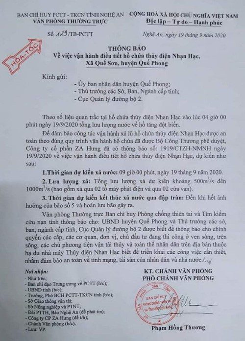 Cũng trong sáng 19/9, Văn phòng thường trực Ban chỉ huy phòng chống thiên tai và tìm kiến cứu nạn Nghệ An đã phát đi công văn số 129/TB-PCTT về việc vận hành xả lũ hồ chứa thủy điện Nhạn Hạc (huyện Quế Phong). Thời gian bắt đầu xả là từ 09h, ngày 19/9. Tổng lưu lượng xả là từ 500m3 đến 1.000m3/s, bao gồm lưu lượng xả qua 2 cửa van và qua 2 tổ máy phát điện. Vào 05h sáng cùng ngày, hồ chứa nước thủy điện Châu Thắng cũng tiến hành xả lũ với lưu lượng từ 76m3 đến 700m3/s, bao gồm lưu lượng xả qua cửa van và lưu lượng phát điện qua tổ máy. Thời gian hết xả dự kiến sẽ đến hết mưa lũ do cơn bão số 5 và hoàn lưu bão gây ra.