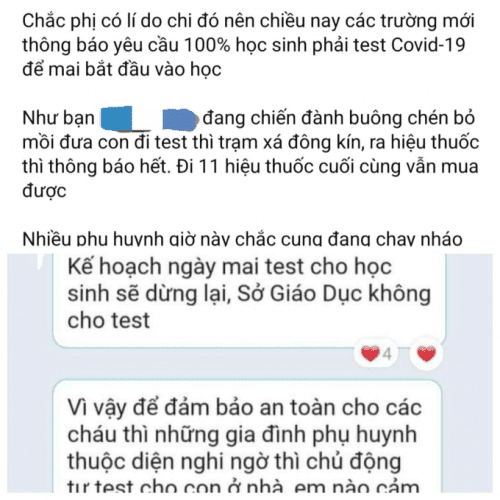 Chiều tối 06/02, trên một số trang mạng xã hội xuất hiện thông tin ngành giáo dục tại một địa phương tại Nghệ An yêu cầu test Covid-19 bắt buộc đối với học sinh trước khi trở lại trường vào ngày mai 07/02.