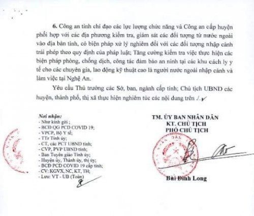 - Công an tỉnh chỉ đạo các lực lượng chức năng và Công an cấp huyện phối hợp với các địa phương kiểm tra, giám sát các đối tượng từ nước ngoài vào địa bản tỉnh, có biện pháp xử lý nghiêm đối với các đối tượng nhập cảnh trái phép theo quy định của pháp luật: Tăng cường kiểm tra việc thực hiện các biện pháp phòng, chống dịch, công tác đảm bảo an tỉnh tại các khu cách ly y tế cho các chuyên gia, lao động kỹ thuật cao là người nước ngoài nhập cảnh và làm việc tại Nghệ An.