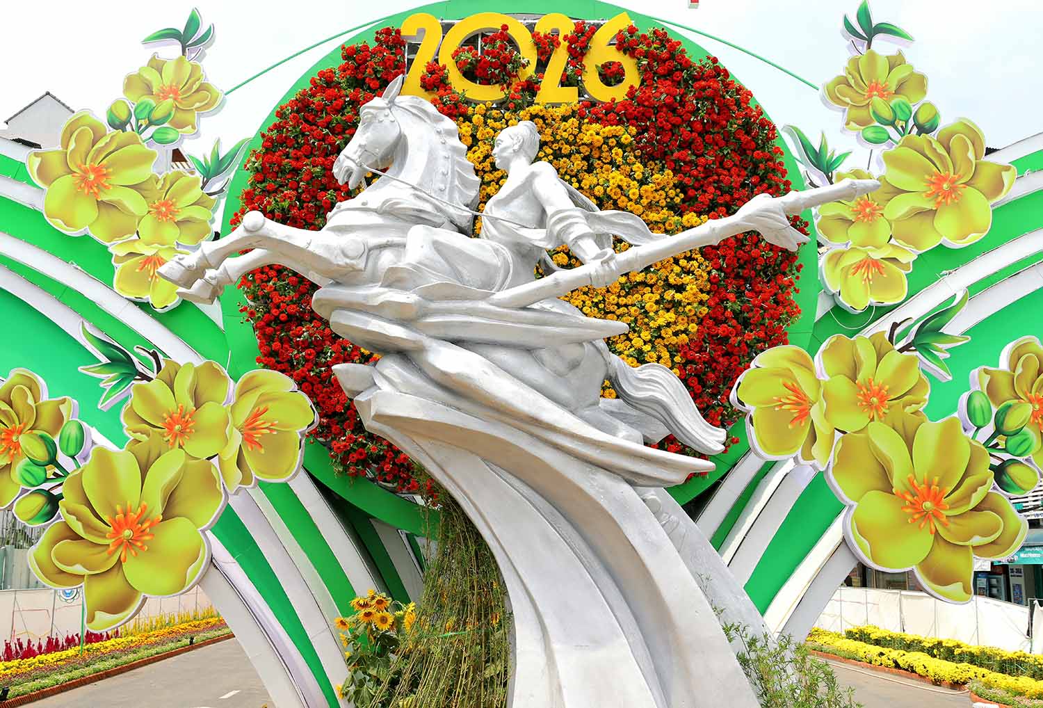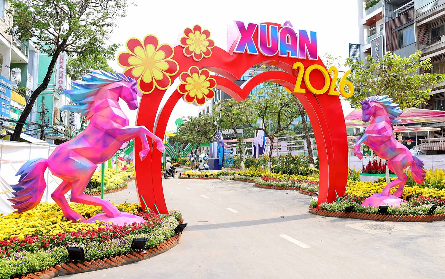 Năm Bính Ngọ nên Đường Hoa nổi bật hình tượng những con ngựa nhiều sắc màu rộn ràng tươi đẹp. Khu vực cổng chính có hình tam mã phi nước đại, hai bên là cụm hoa mai cùng các mô hình hoa mai, hoa đào, lá tre.