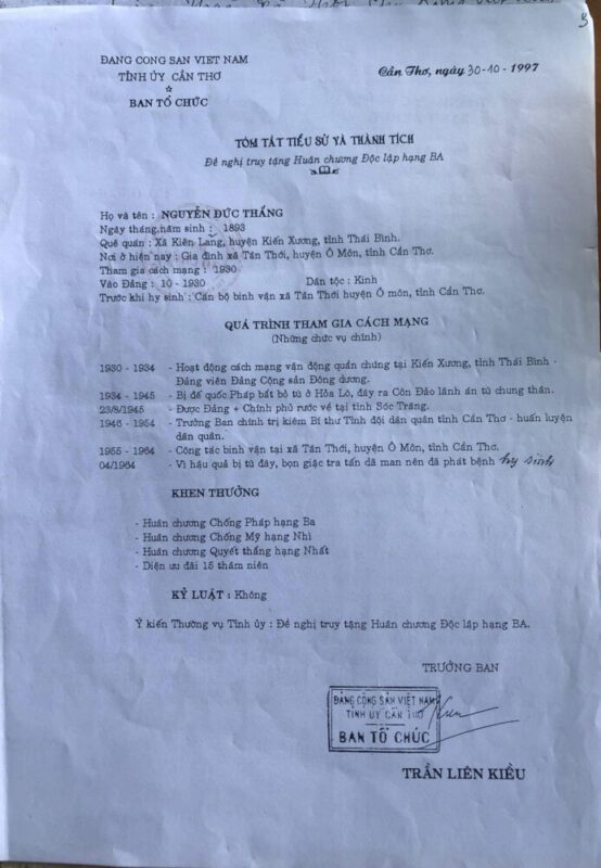 Hồ sơ tại Ban Tổ chức Thành ủy Cần Thơ cho biết, cụ Thắng sinh năm 1893 ở xã Kiên Lãng (Kiến Xương, Thái Bình), vào Đảng tháng 10/1930, bị đế quốc Pháp bắt giam, bỏ tù Hòa Lò rồi xử tù chung thân đày ra Côn Đảo từ năm 1934-1945. Ngày 23/8/1945, cụ được đón về đất liền và từ năm 1946 – 1954 làm Trưởng Ban chính trị kiêm Bí thư Tỉnh đội dân quân tỉnh Cần Thơ. Sau đó, do hậu quả bị tù đày tra tấn nên sức khỏe yếu, từ năm 1955, cụ làm công tác binh vận tại xã Tân Thới (nay thuộc huyện Phong Điền, Cần Thơ) và phát bệnh, qua đời năm 1964. Cụ được tặng thưởng nhiều Huân chương.