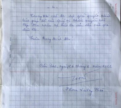 Ngày 26/6/2022, ông Hòa làm đơn gửi nhiều cơ quan “xin rút lại đơn bãi nại đề ngày 23/3/2005 và tôi tiếp tục khiếu nại”. Hiện nay, ông Hòa cùng con cháu ở trọ tại phường Bùi Hữu Nghĩa (Bình Thủy, Cần Thơ) trong cảnh rất khó khăn. “Mấy chục năm qua, chính quyền cơ sở cứ đẩy gia đình tôi vào cảnh cùng quẫn. Cuối năm ngoái, nhờ sự quan tâm của Thành ủy Cần Thơ và Sở LĐTB&XH mà gia đình tôi được nhớ đến. Nay gia đình tôi mong được làm việc với đại diện chính quyền biết quan tâm để hỗ trợ đúng pháp luật cho gia đình tôi có chỗ ở ổn định”, ông Hòa nghẹn ngào trong căn nhà trọ chật chội.