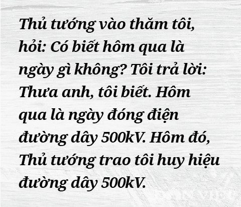 – Thủ tướng có nói với tôi nếu đường dây 500kV không thành công thì tôi sẽ từ chức. Tôi có nói với anh em ngành điện là ông Kiệt phát biểu như thế đấy. Chúng tôi càng quyết tâm hơn. Ngoài ra, trong quá trình làm, có nhiều người ở miền Nam gọi điện ra nói là trong đó đang rất thiếu điện, càng giúp chúng tôi có thêm động lực để quyết tâm hơn.